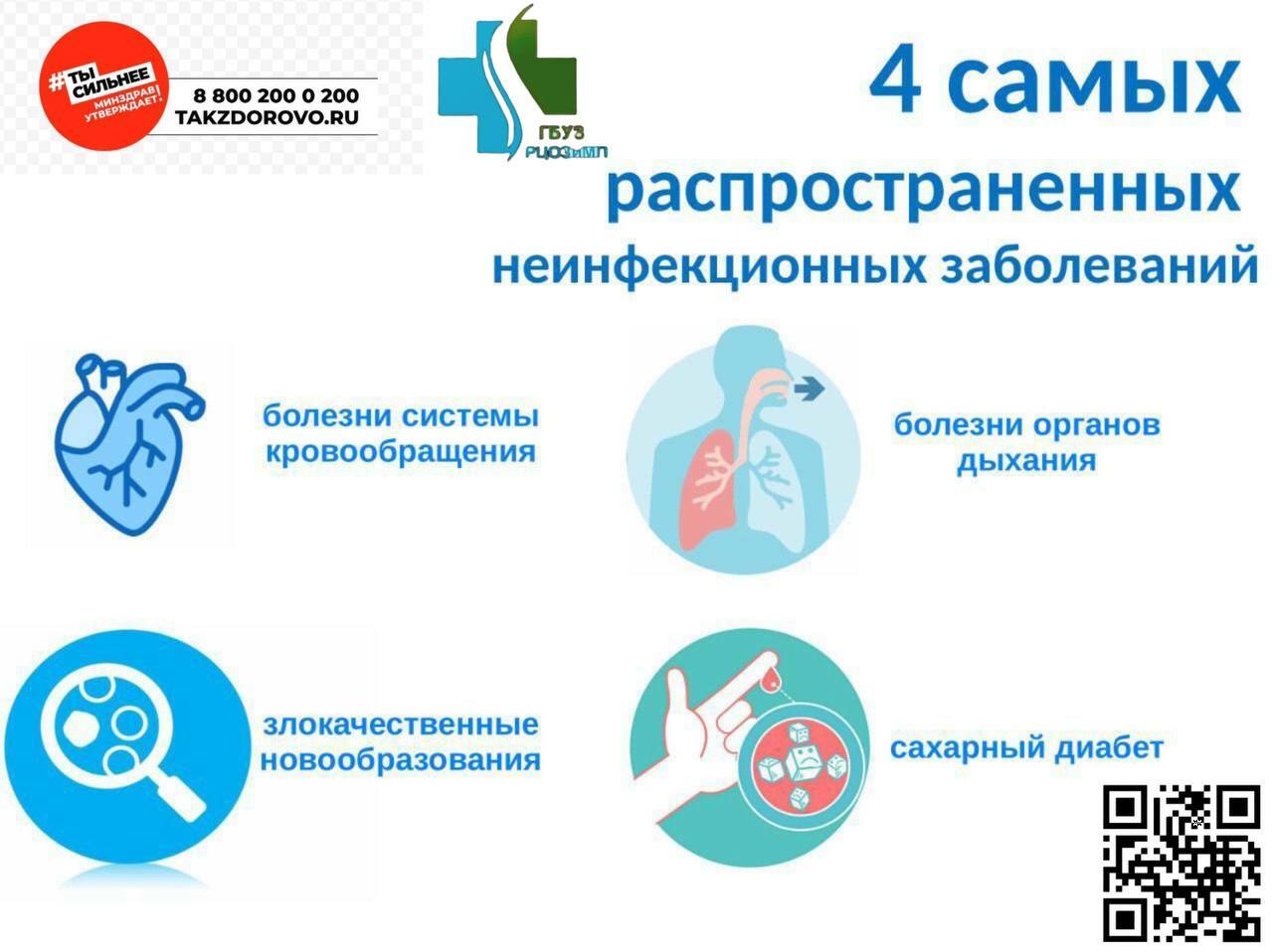 Это группа заболеваний, которые развиваются постепенно и часто связаны с образом жизни человека. К ним относятся сердечно-сосудистые болезни, онкологические заболевания, сахарный диабет и хронические респираторные патологии.